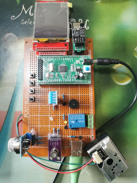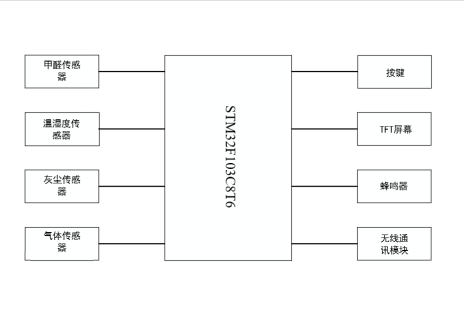 基于STM32的家居安防系统分为硬件和软件两部分。硬件由核心传感器模块和其他外设模块组成,主要通过不同功能的传感器采集周围环境数据,可用到传感器有DHT11温湿度传感器,烟雾传感器GP2Y1051AU0F,MS1100甲醛传感器,其他外设模块有蜂鸣器,TFT-LCD液晶显示屏,按键模块和WiFi串口模块;软件由环境检测和无线报警模块和显示模块组成,主要检测传感器采集到的数据,若为异常信号则传输高电平,启动蜂鸣器并触动报警机制,执行预先设定好的应对方案,若为正常信号则将数据正常显示出来。
