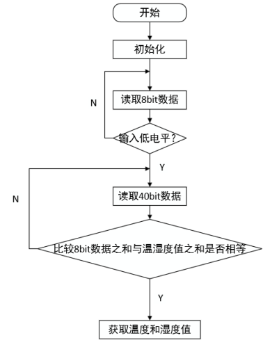 温湿度传感器连接MCU的I/O口为PA4口。首先初始化I/O口参数;初始化之后读取8bit的温度整数数数据、温度小数数据、湿度整数数据、湿度小数数据,若输入为低电平则进入下一位数据接收,若不为低电平则继续读取8bit数据;之后读取传感器内部得到的温度和湿度值的40bit数据,若先前读取的4组8bit数据之和与温度和湿度值之和相等则读取成功,否则为读取失败,失败则再次读取直到成功为止,读取成后进入下一步;最后得到温度和湿度值。其程序流程如下图所示: