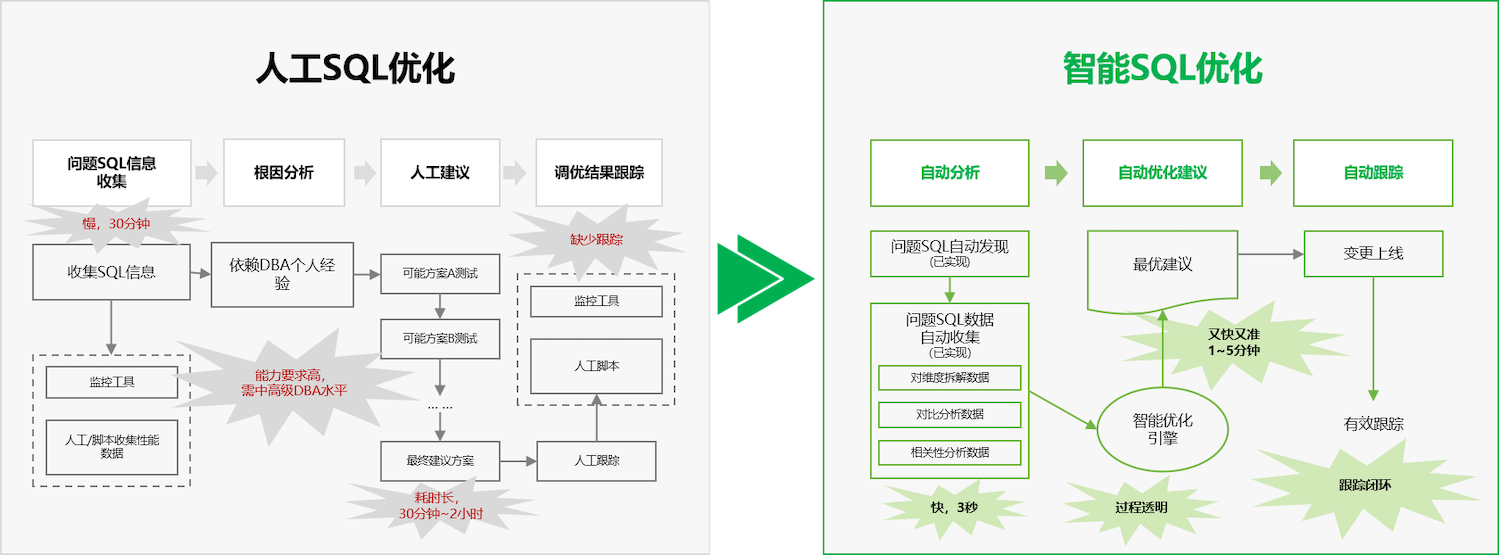 性能优化可以说是数据库运维领域里门槛最高的,长期以来高度依赖资深DBA的经验:收集信息、判断方案、AB测试、上线跟踪,单条SQL的优化就可能耗时几十分钟甚至数小时。