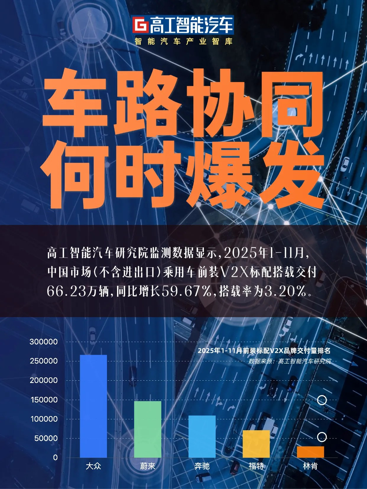 高工智能汽车研究院监测数据显示,2025年1-11月,中国市场(不含进出口)乘用车前装V2X标配搭载交付66.23万辆,同比增长59.67%,搭载率为3.20%。形成对比的是,同期5G配置(含选装)搭载交付561.90万辆,同比增长91.09%,搭载率升至27.14%。