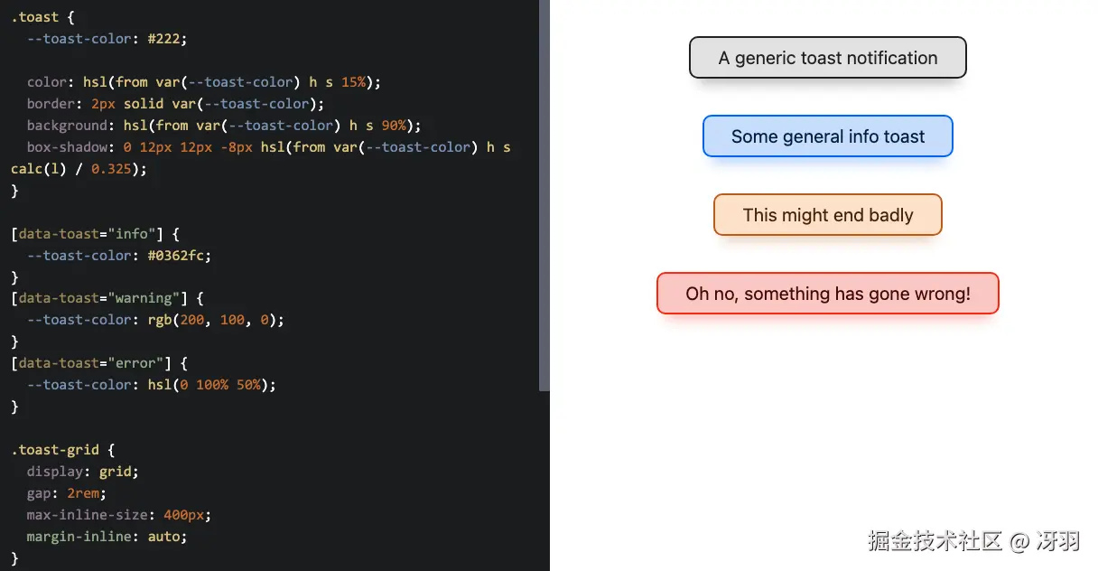 比如实现一个 Toast,它可能基于一种基础颜色,然后创建一种较深的颜色用于文本,一种较浅的颜色用于背景,还需要一个不透明度较低的颜色用于阴影。