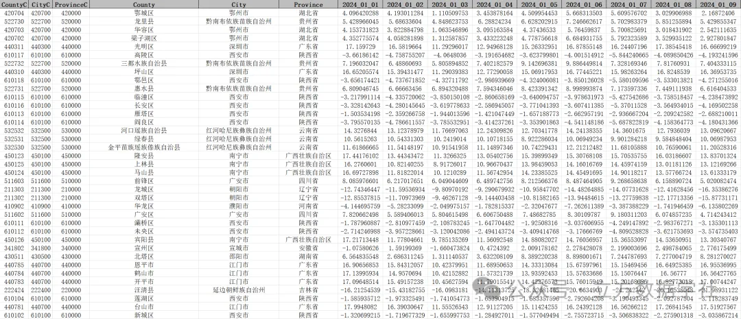 基于原始的逐日最低气温栅格数据,我们采用国家地理信息公共服务平台(天地图)发布的审图号为GS(2024)0650号的2024年省市县三级行政区划Shp数据(可查看之前的文章获悉详情),对每个省\每个地级市\每个区县内的栅格值进行了求平均数处理,得到了省市县三级的逐日的最低气温数据!