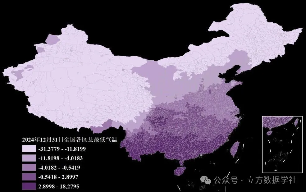 接下来是Shp格式的数据,1980-2024年的区县层级的逐日最低气温数据同样按照年份进行汇总,属性表的字段和Excel相同。我们具体以2024年12月31日各区县的最低气温数据为例进行预览: