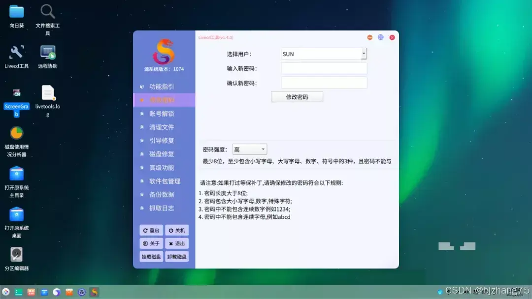 进入PE系统后,打开"Livecd工具",选中"修改密码",选择用户,直接输入需要修改的新开机密码;