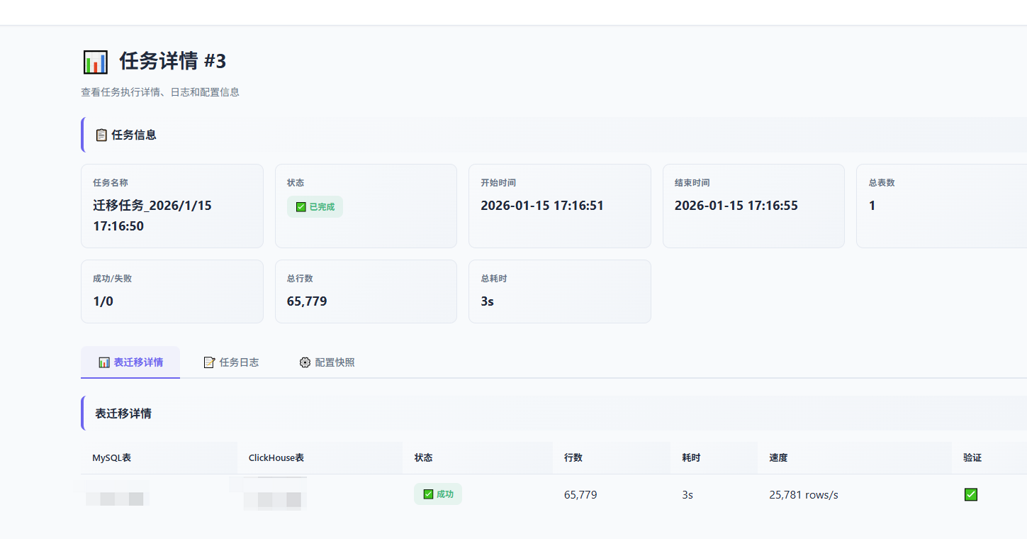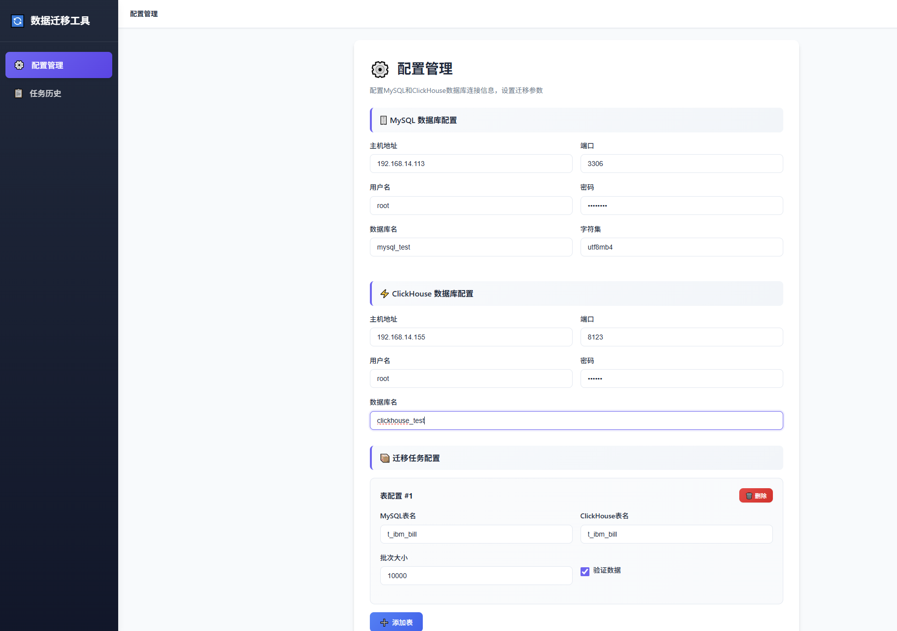 一个功能强大、易于使用的 MySQL 到 ClickHouse 数据迁移工具,支持 Web 界面管理和命令行执行,适用于大规模数据迁移场景。