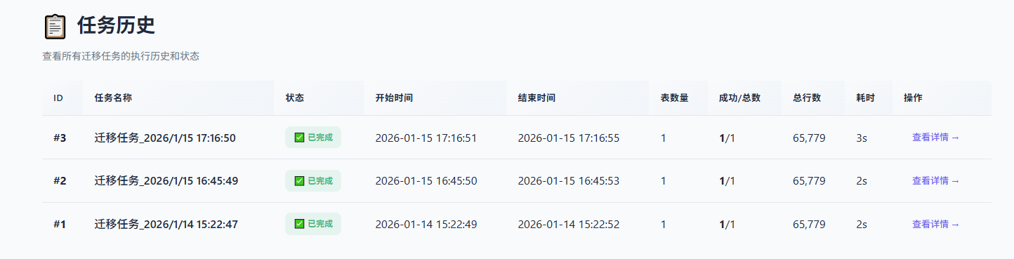 - 🚀 高性能迁移:采用流式读取和批量插入,支持大规模数据迁移