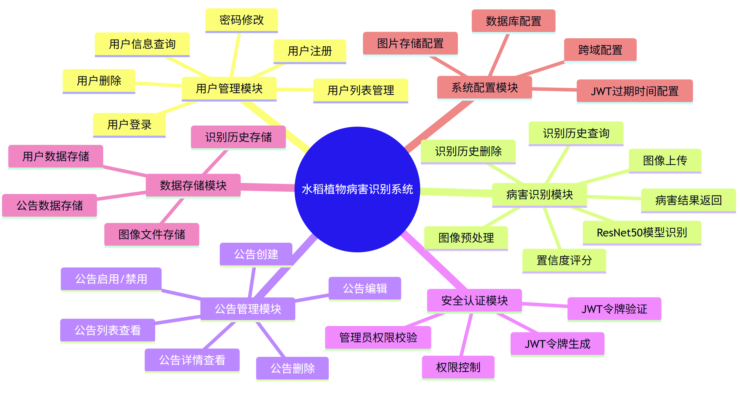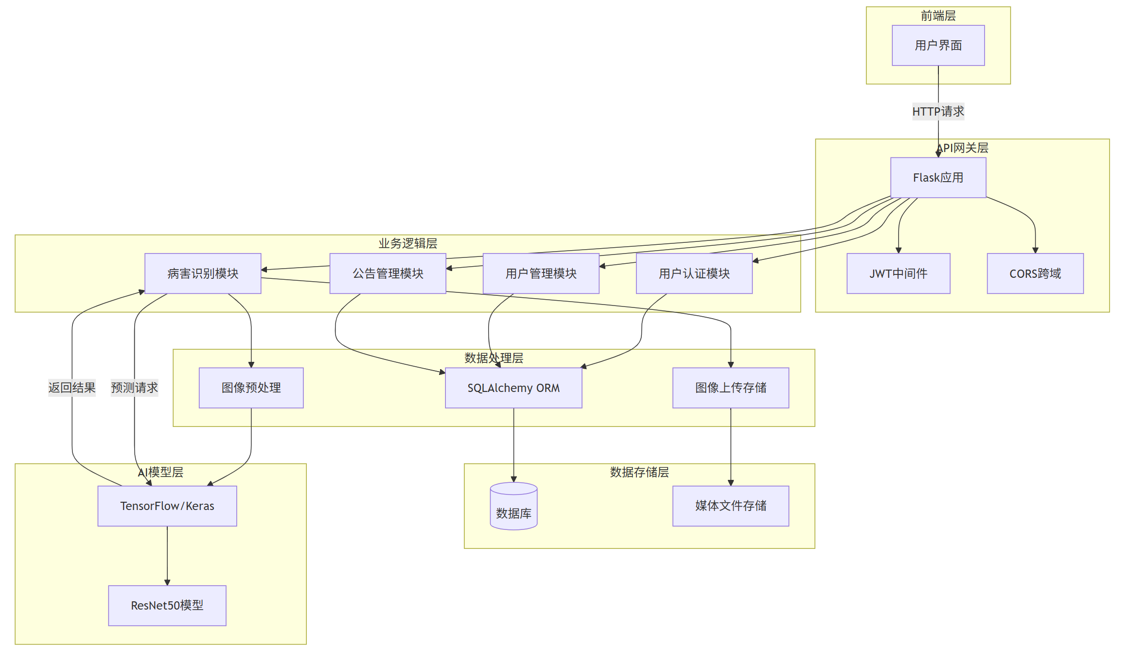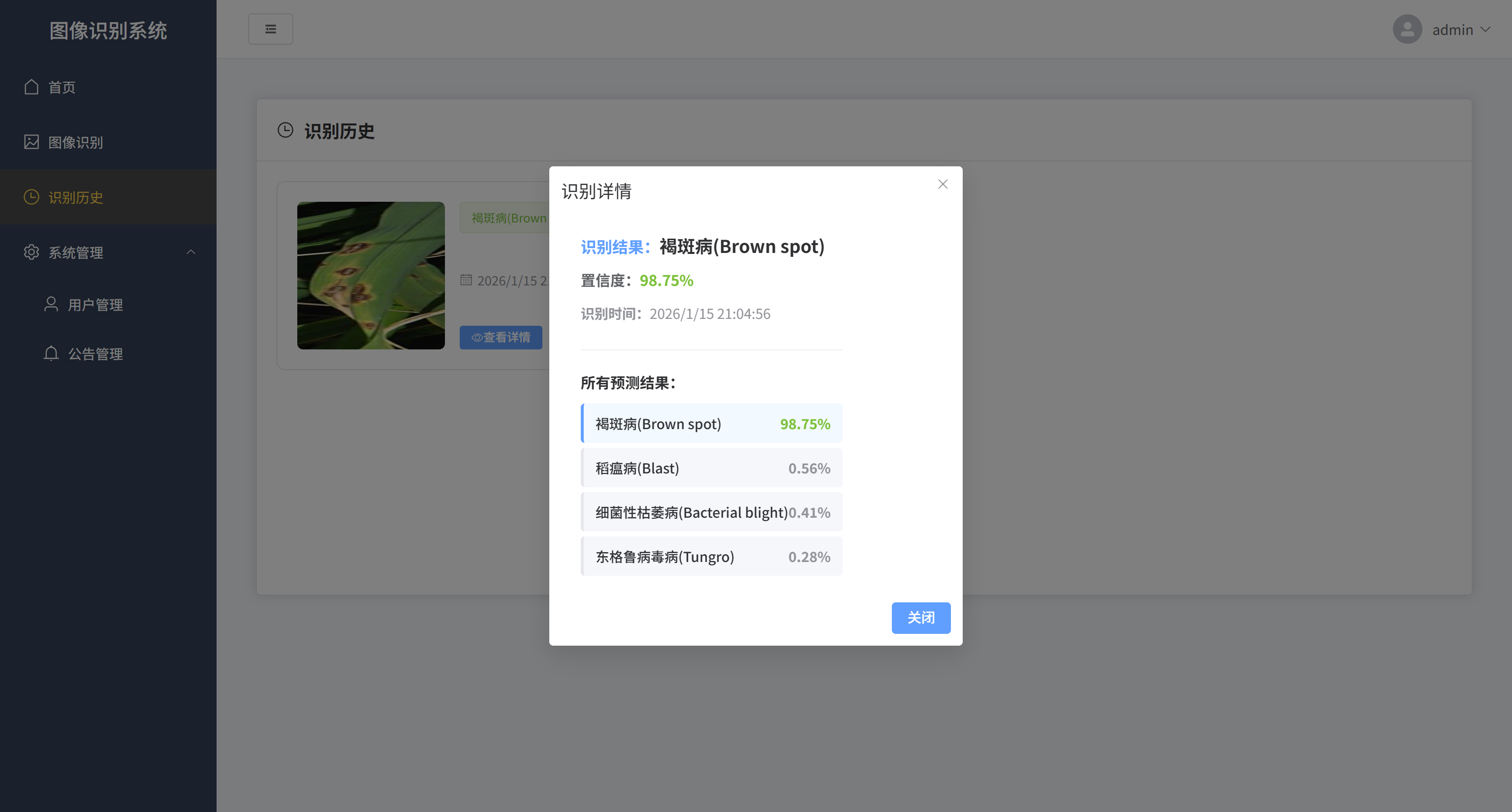水稻植物病害识别系统是一个基于深度学习的Web应用平台,旨在为农业生产提供智能化的病害诊断服务。系统采用前后端分离架构,后端使用Flask框架构建RESTful API,集成TensorFlow深度学习框架和ResNet50卷积神经网络模型,能够精准识别水稻的四种常见病害:细菌性枯萎病、稻瘟病、褐斑病和东格鲁病毒病。系统具备用户管理、身份认证、图像识别、历史记录查询和公告管理等核心功能,采用JWT令牌机制实现安全认证,数据库进行数据持久化存储。通过友好的Web界面,农户或农业技术人员只需上传水稻叶片图像,即可快速获得病害识别结果及置信度评分,为及时采取防治措施提供科学依据,有效提升病害诊断效率和准确度。