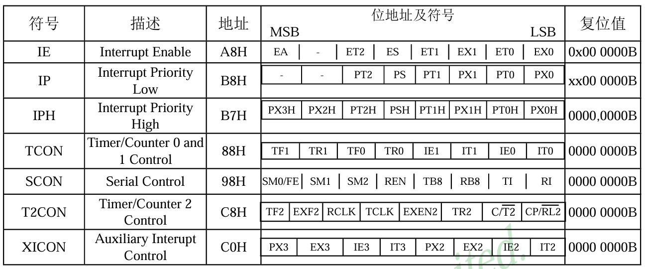 | 中断源 | 对应引脚 | 中断向量地址 | 优先级查询次序 | 中断允许位 | 中断标志位 |