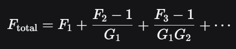 在多级系统中(如放大器、滤波器、混频器级联),系统的总噪声系数由 Friis 公式 描述: