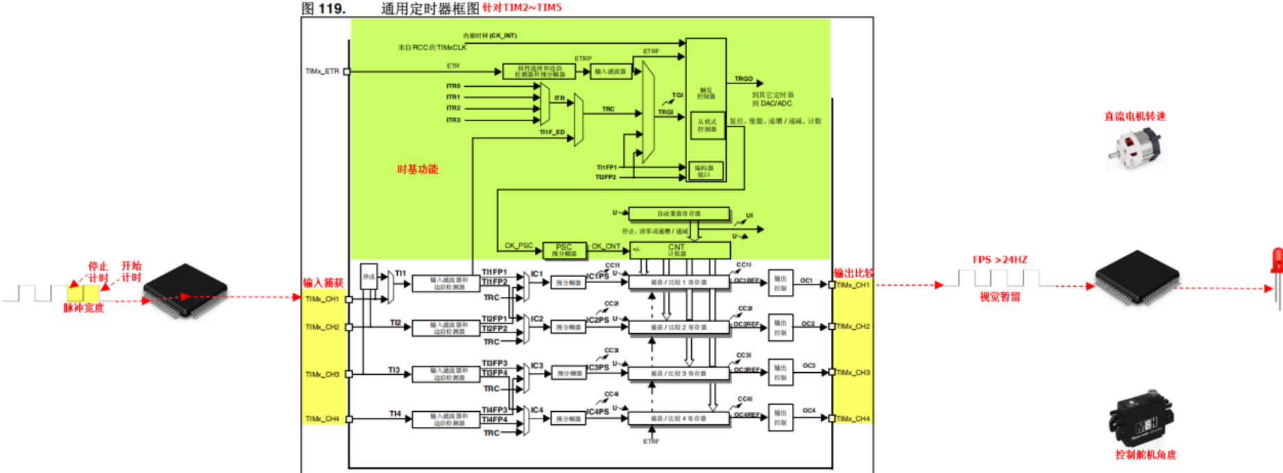 - 时钟使能:所有定时器和对应GPIO口必须先开启时钟,否则配置无效;