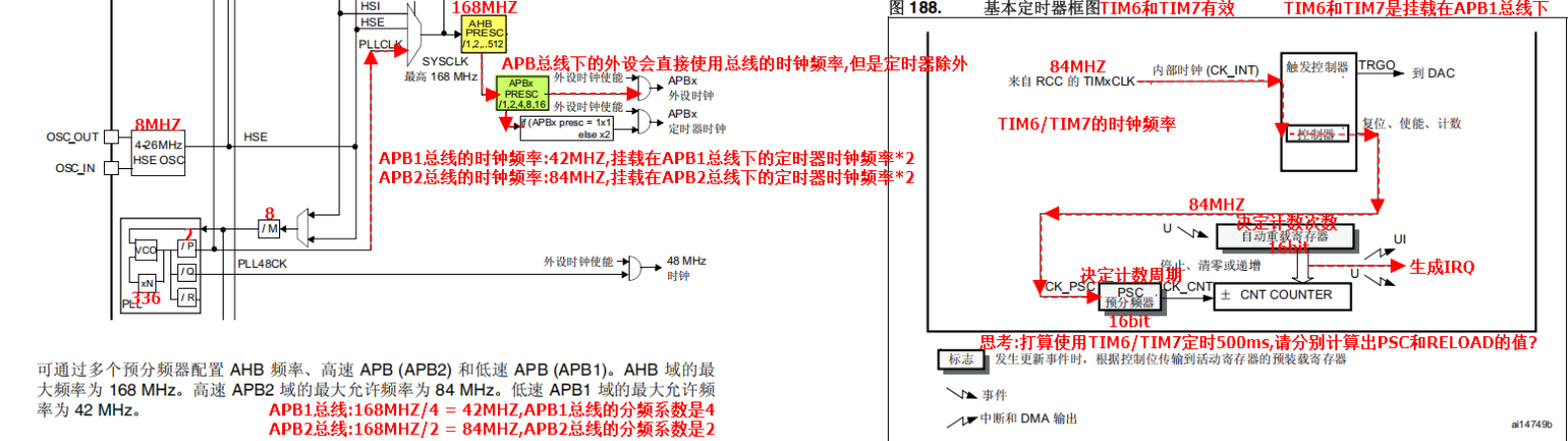 - APB2总线:最大频率84MHz,挂载定时器TIM1、TIM8~TIM11;若APB2分频系数为1,定时器时钟=APB2频率;若分频系数>1,定时器时钟=APB2频率×2(最终为168MHz)。