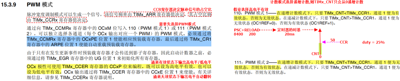 TIM_OCInitStructure.TIM_OCMode = TIM_OCMode_PWM1; // PWM1模式:递增计数时,CNT<CCR通道有效,否则无效