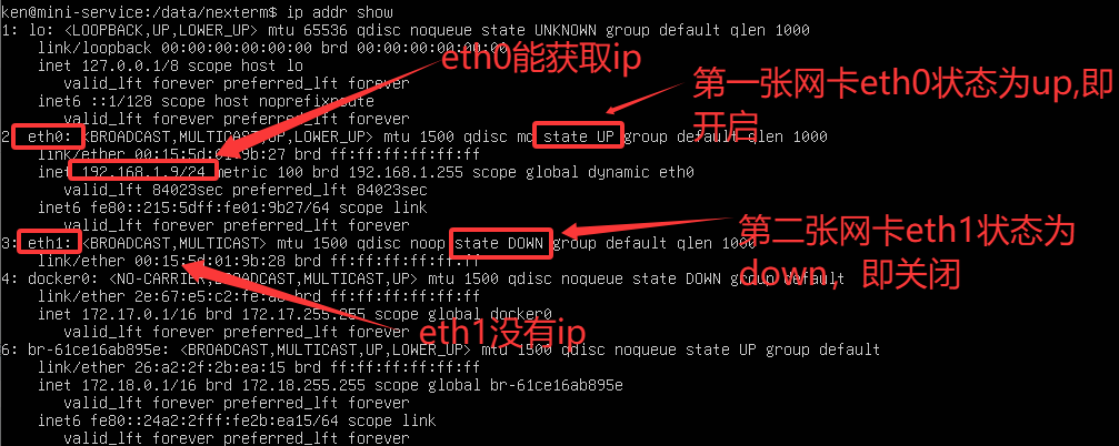 第一张网卡eth0是安装系统前就已经有的,安装系统时会初始化该网卡,所以能正常获取IP。第二张网卡eth1是后来添加的,系统没有初始化该网卡,所以状态为down,且不能获取IP。