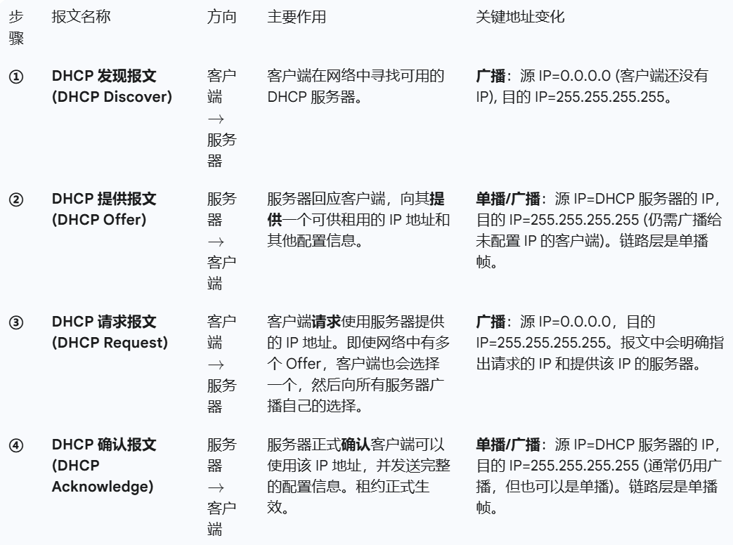 配置信息: 步骤 ② (提供) 和 ④ (确认) 中携带了客户端将要使用的 IP 地址、租用期、子网掩码和默认网关 等关键配置信息。Offer / ACK:IP 广播,MAC 单播(真正的"题眼")。一样