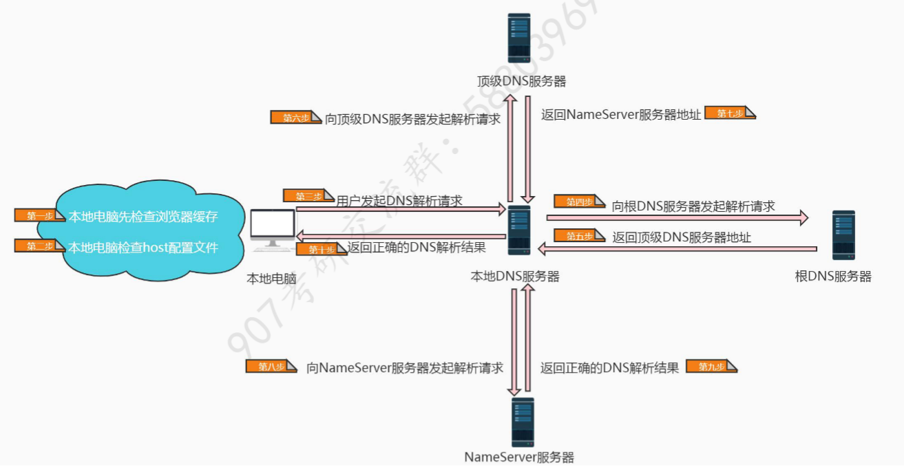 缓存优化 (第七步): 为了提高效率、减轻服务器负担,解析结果会根据 TTL(生存时间) 值在客户端和递归解析器端 进行缓存,从而避免重复查询。