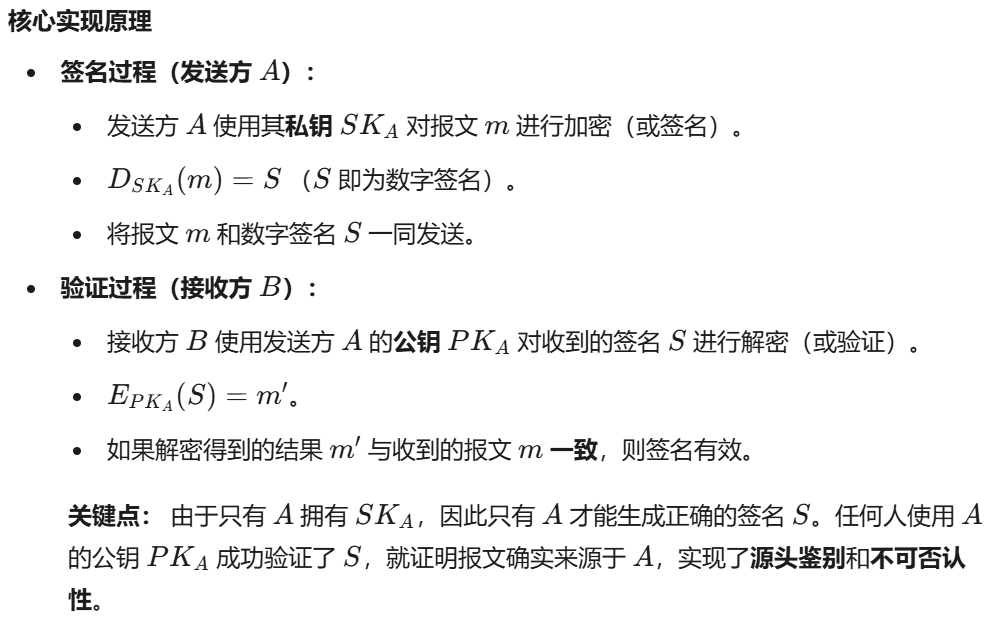 鉴别性与不可否认性: 由于只有 A 持有 SK*{A},B 能用 PK*{A} 成功还原 X,即证明签名操作确实由 A 完成。