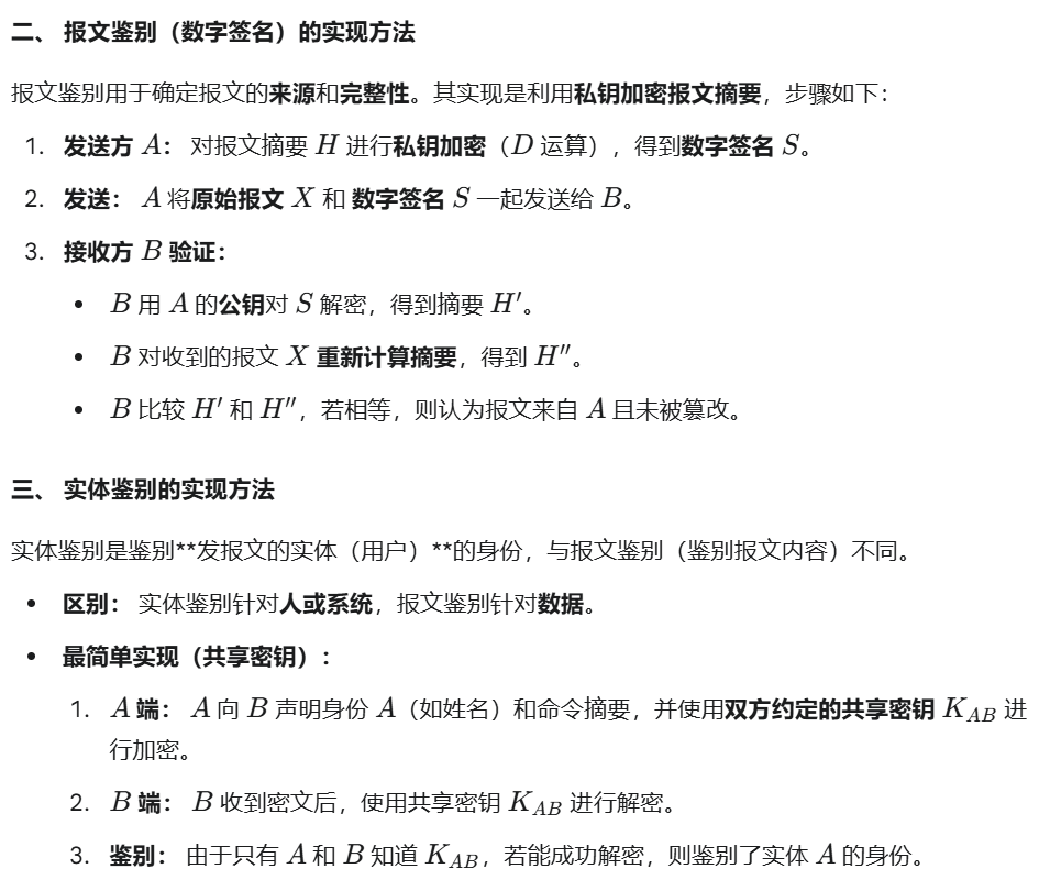 (1) 报文鉴别 (Message Authentication): 接收者能核实签名,确信报文是发送者发送的,防止他人伪造签名。