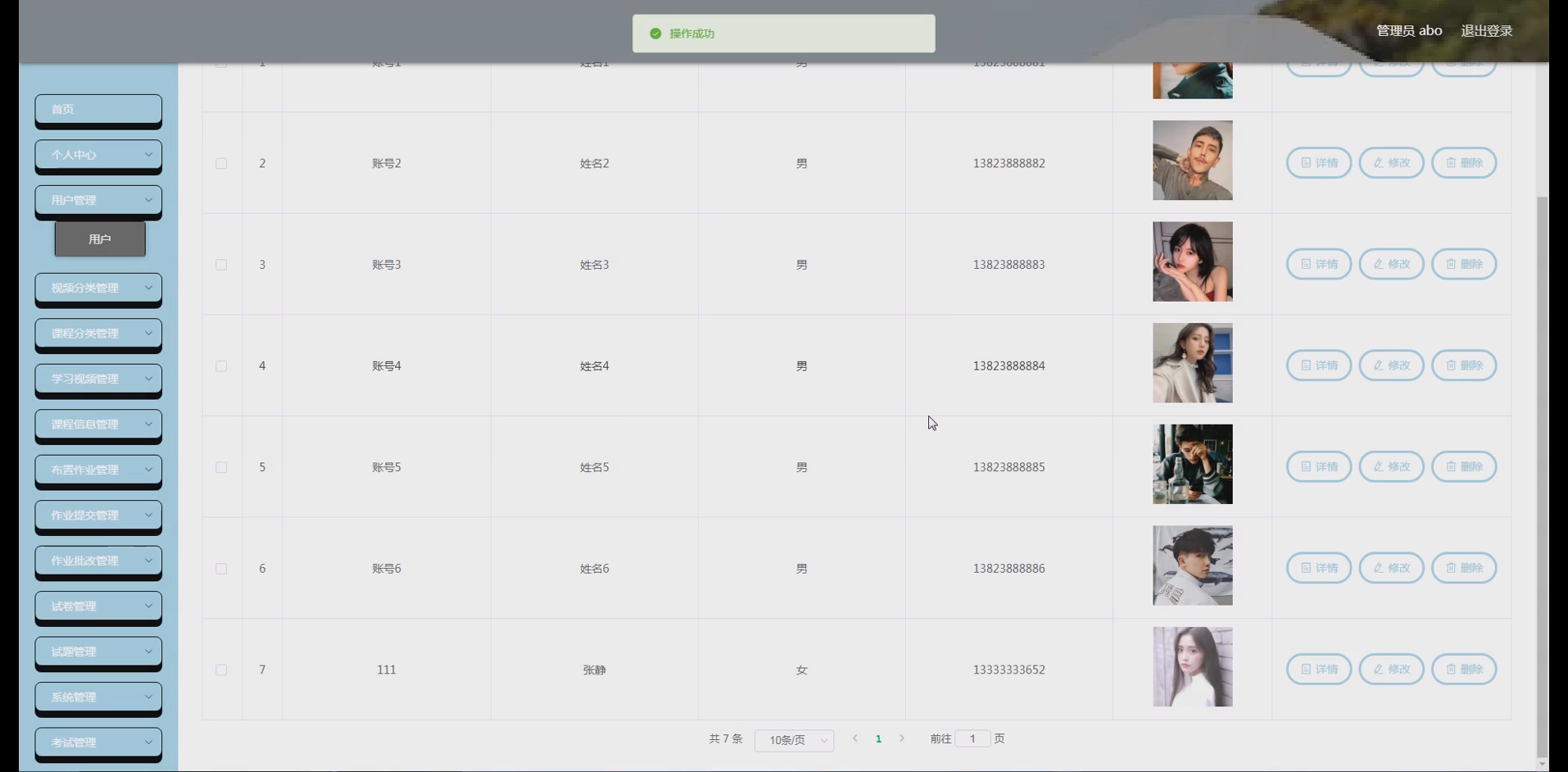 系统项目功能:用户,视频分类,课程分类,学习视频,课程信息,布置作业,作业提交,作业批改,考试成绩