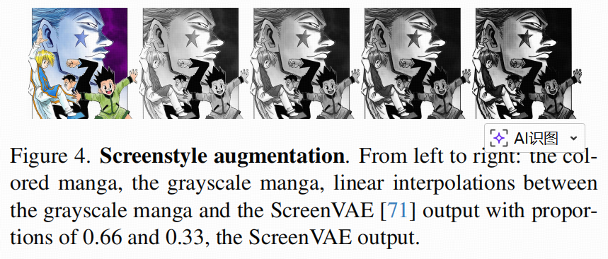 - 用 ScreenVAE 把彩色漫画转换成日式黑白网点风格输出,再与普通灰度图做随机线性插值,扩充"黑白风格分布",提升泛化。