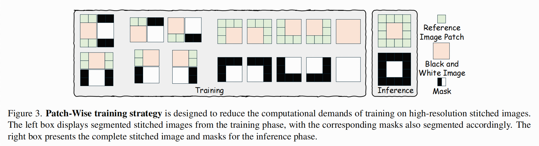 - 因为拼贴后的图分辨率高、成本大,所以训练时随机裁剪一块来训,但保证黑白区域始终被包含,mask 也同步裁剪;推理时用完整拼贴图获取最大上下文。