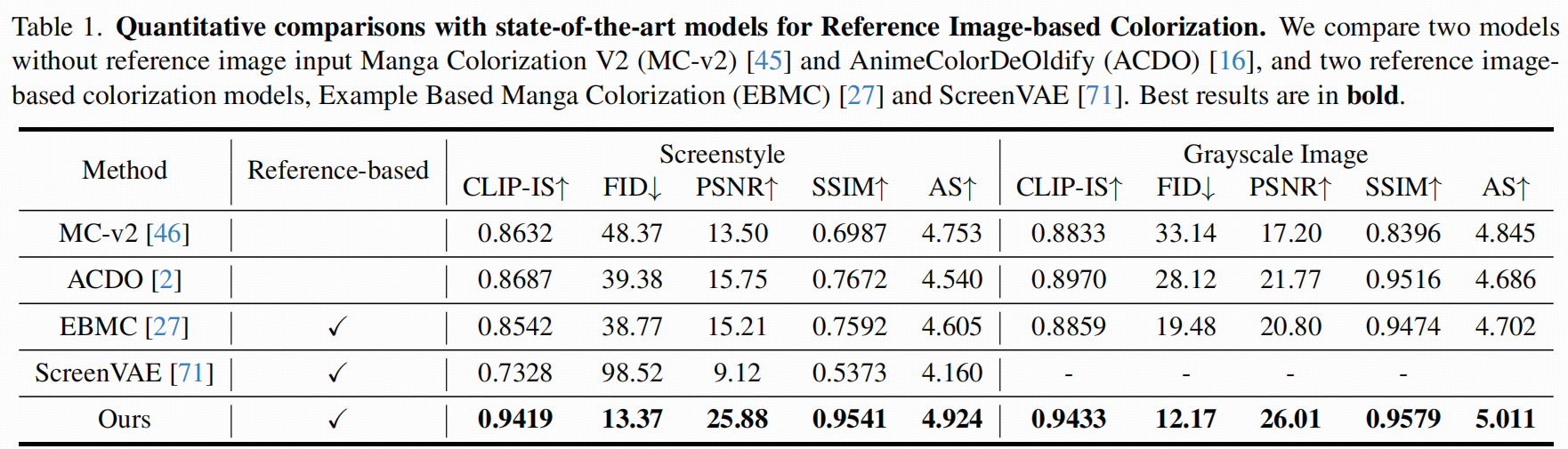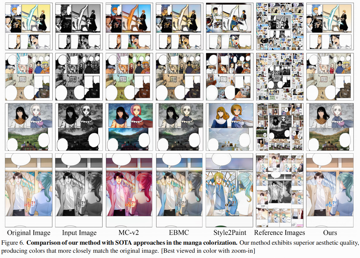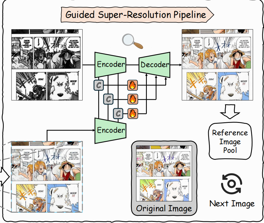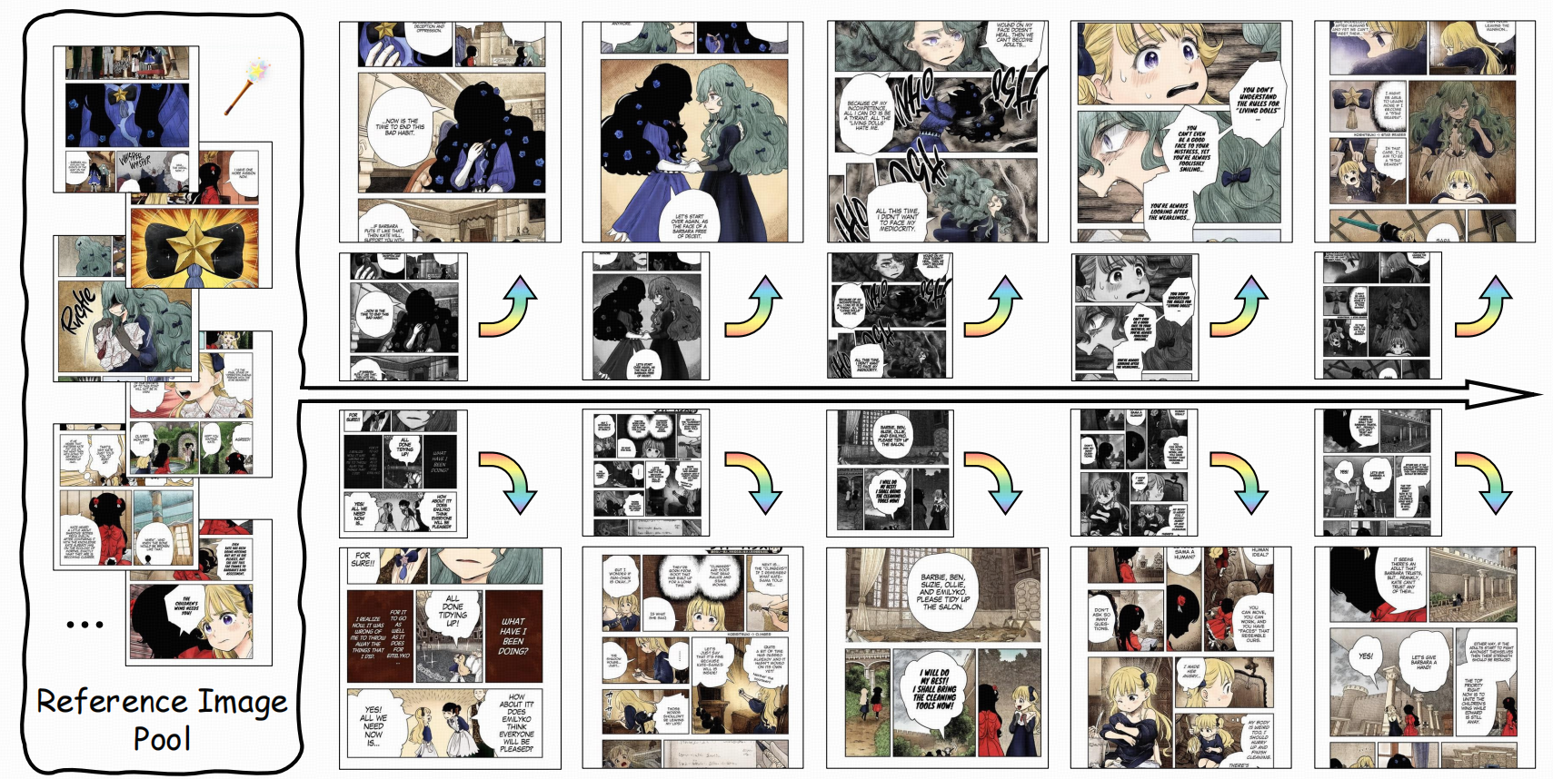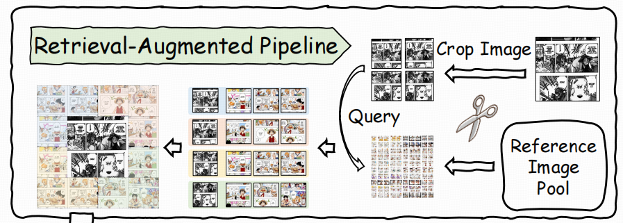 输入:一张待上色的黑白图(来自漫画/分镜序列中的某一帧)+ 一个"参考图池"(同章节或同序列里若干张已经有颜色的图)。