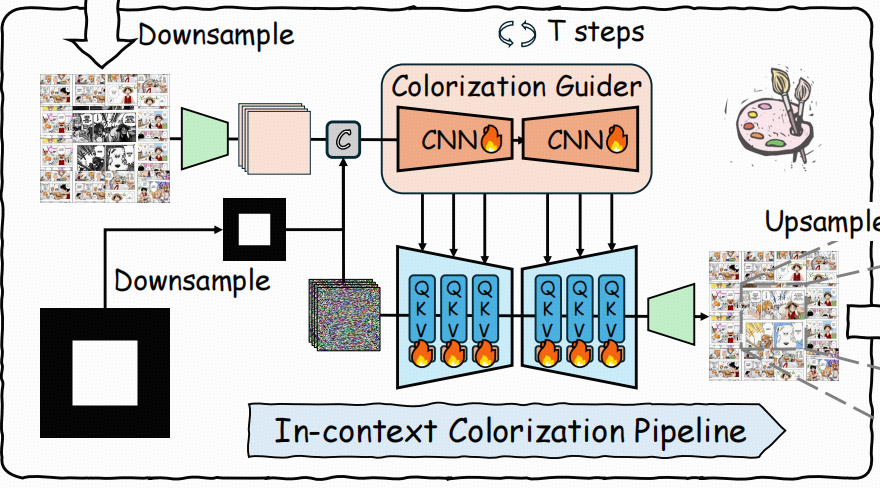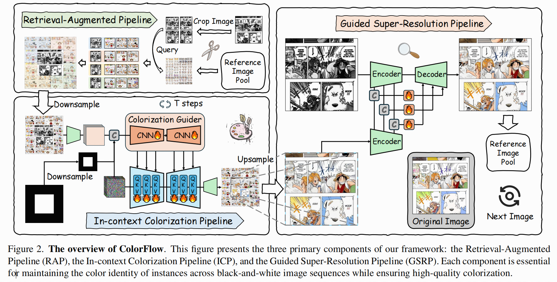 现有问题:不是把一张黑白图随便上色,而是要在同一角色跨多张分镜/多帧时,尽量保持发色、衣服配色等"身份颜色(ID color)"一致,而且还要让操作流程"像工具"一样好用:不需要为每个角色单独 finetune,也不强行抽取显式的 ID embedding。论文把整个方案拆成三个阶段:RAP(检索增强)、ICP(in-context 扩散上色)、GSRP(引导式超分复原)。