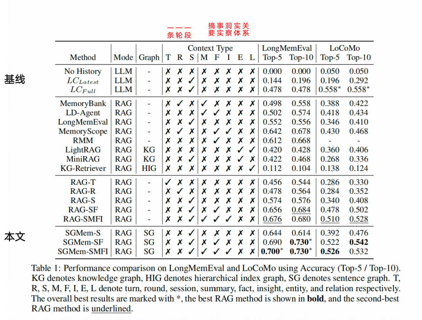 作者给出的效果比较表有个额外的好处,就是标明了其他对比方法在使用历史数据时的粒度(比如单句 User 话语、单轮 User 和 Assistant 的交互,或者一段时间内的完整互动),以及建索引时是从哪个维度做的二度抽象(比如总结、事实提取、关键洞察、关系提取等等)。