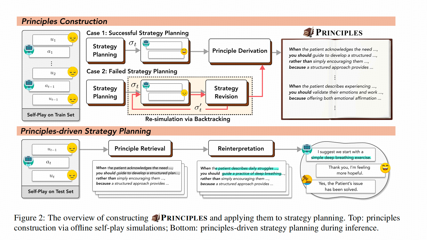 这个方法针对的是引导性对话的场景,这个方法先让策略LLM和演员LLM分别扮演Assistant和User来进行模拟对话,并让评价LLM评估Assistant是否帮助User达到了他的需求(情感需求),然后比对失败路径和成功路径,进而用提示工程提取对话中场景、可采取的成功策略、不建议采取的失败策略及分析原因。