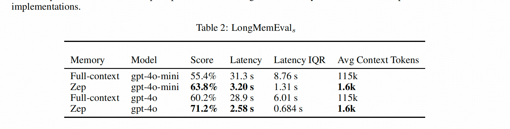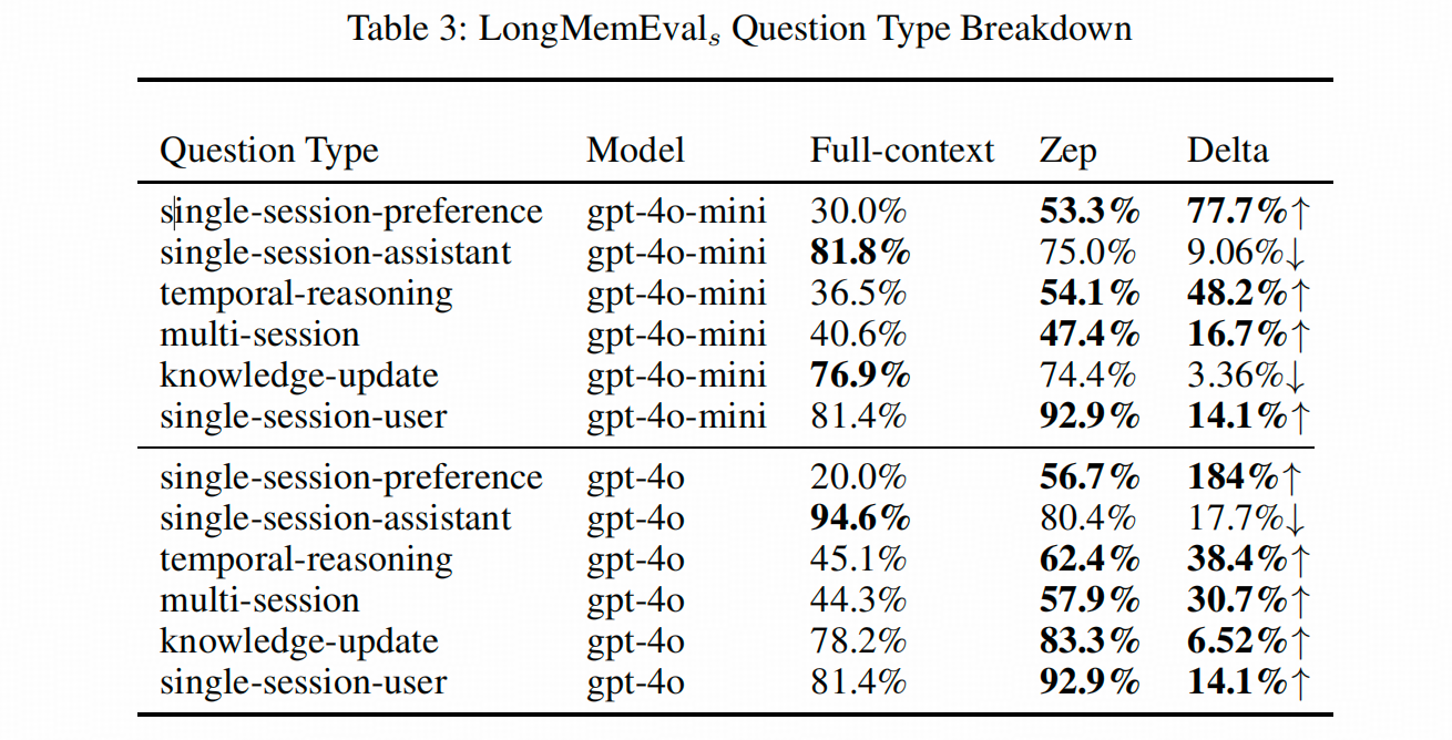 总的来看,在LongMemEval上,Zep在单轮检索(single-session)、时序推理(temporal-reasoning)、跨Session检索(multi-session)以及知识更新(knowledge-update)上都有优势。