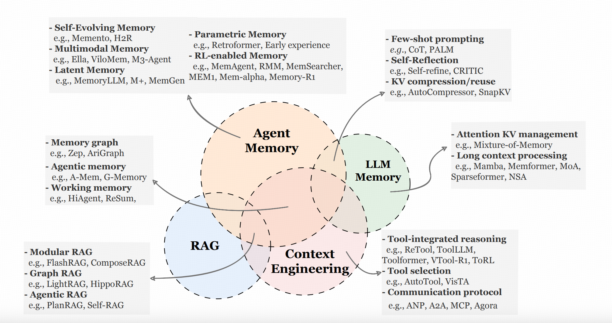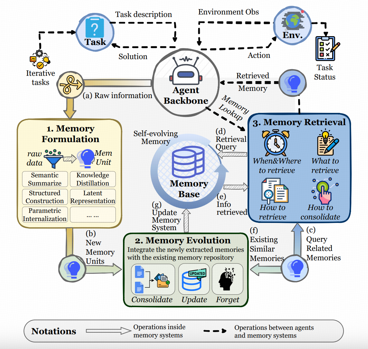 形成,演进,召回。Rethinking Memory in AI: Taxonomy, Operations, Topics, and Future 这篇更早的survey,把记忆的任务分为6大类------梳理、索引、更新、删除、检索、整合,也正好对应这个框架里的 形成,演进,召回
