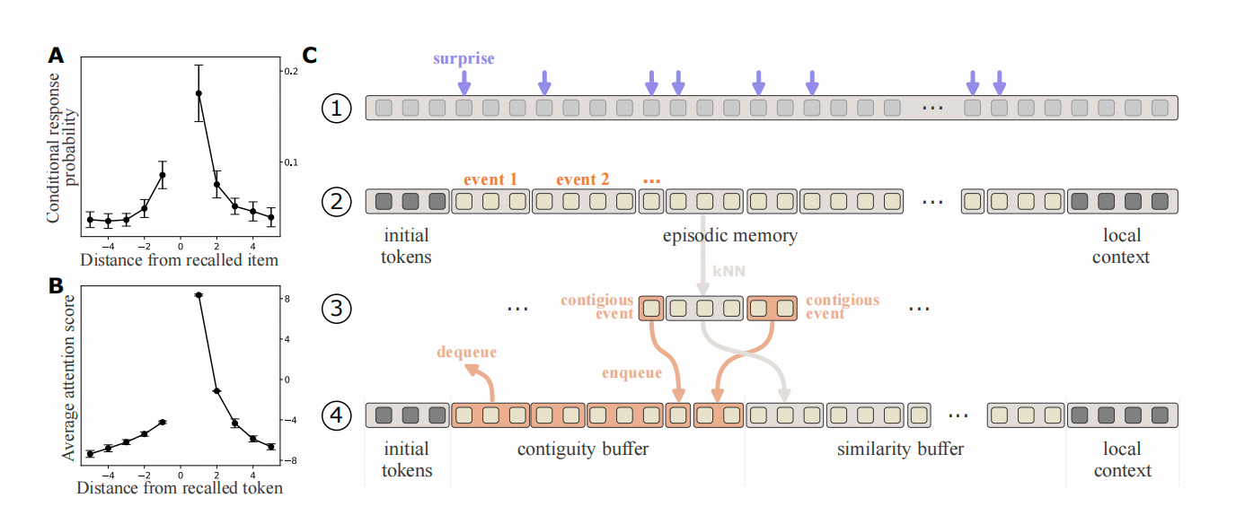 ※ Step 1 :LLM对于当前处理的上下文,计算每个Token的【意外概率】-当前Token被LLM生成的概率,如果概率较低,即LLM对其非常意外,用这个【意外概率】大于阈值的Token作为上下文分块的标志。(分出来的块就是上图的event1等)