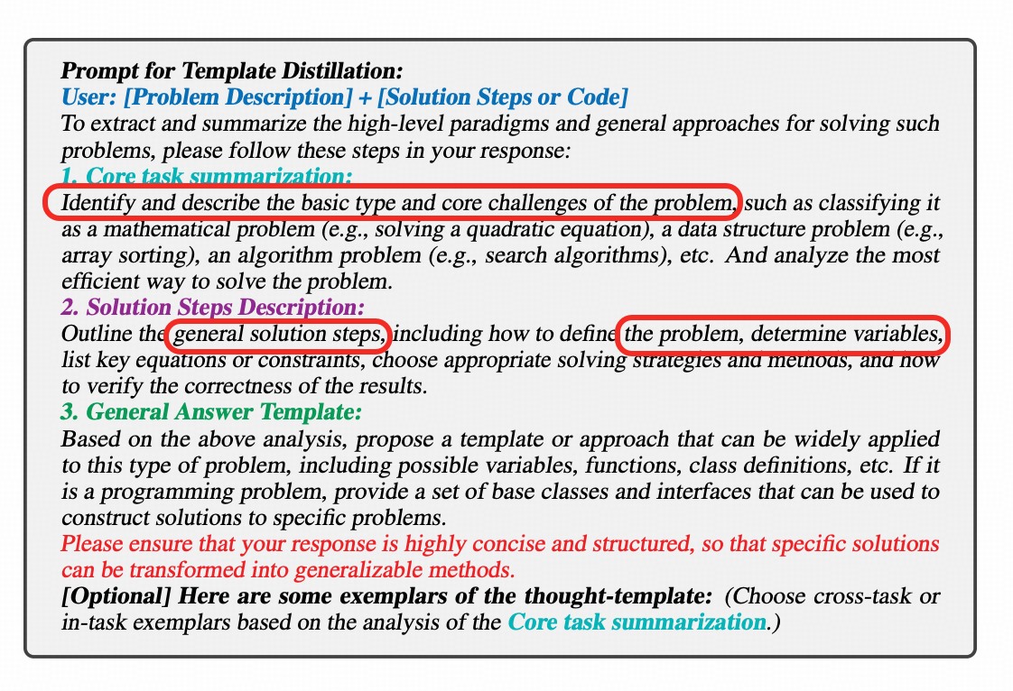 这篇文章的思路是将LLM成功结题的整个COT和回答,二度抽象成一个解题模板,在处理新问题的时候,先用【问题抽取器】(problem distiller)二度抽象当前的问题,然后基于抽象过的问题描述去经验库中查找经验,查到后,就作为提示工程的一部分来知道模型执行任务。