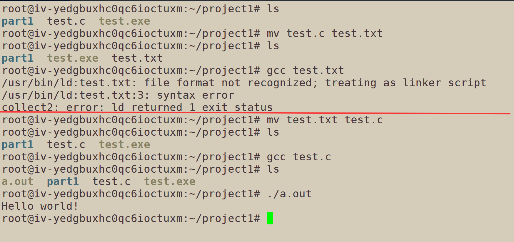 但是,Linux不关心,不代表其他东西不关心,比如gcc编译器。所以我们改了源文件的后缀,就无法编译:
