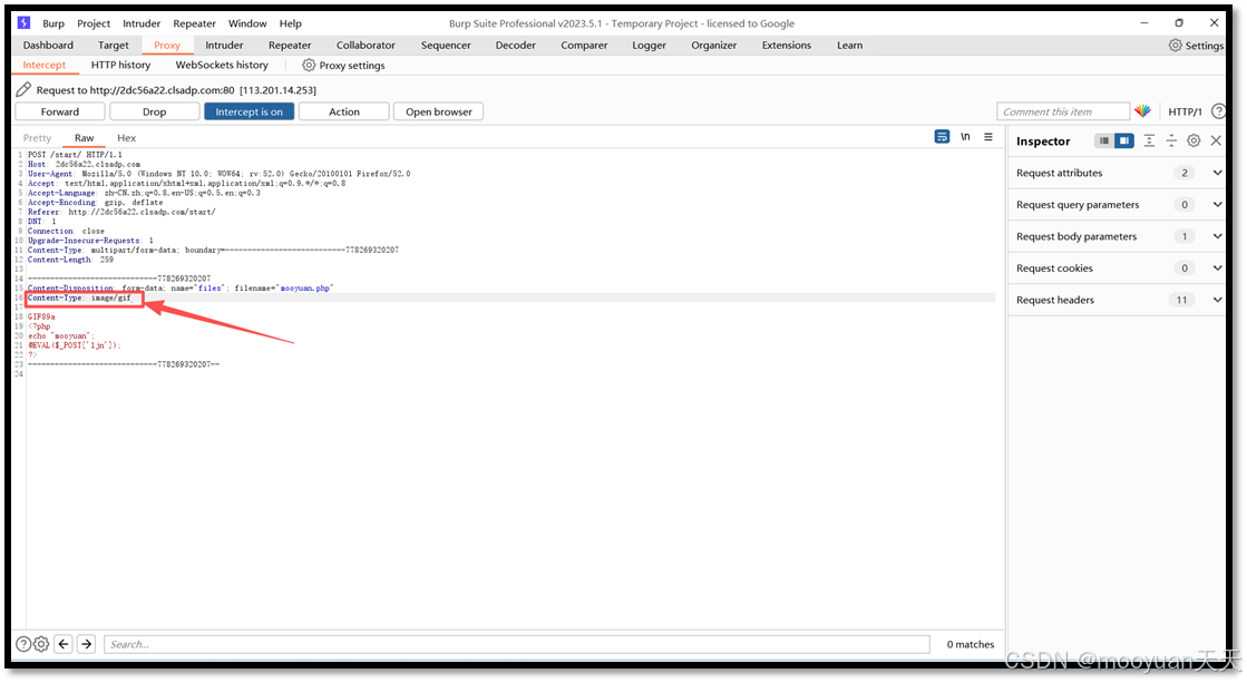 再次上传mooyuan.php,此时报文被bp拦截,具体如下所示。