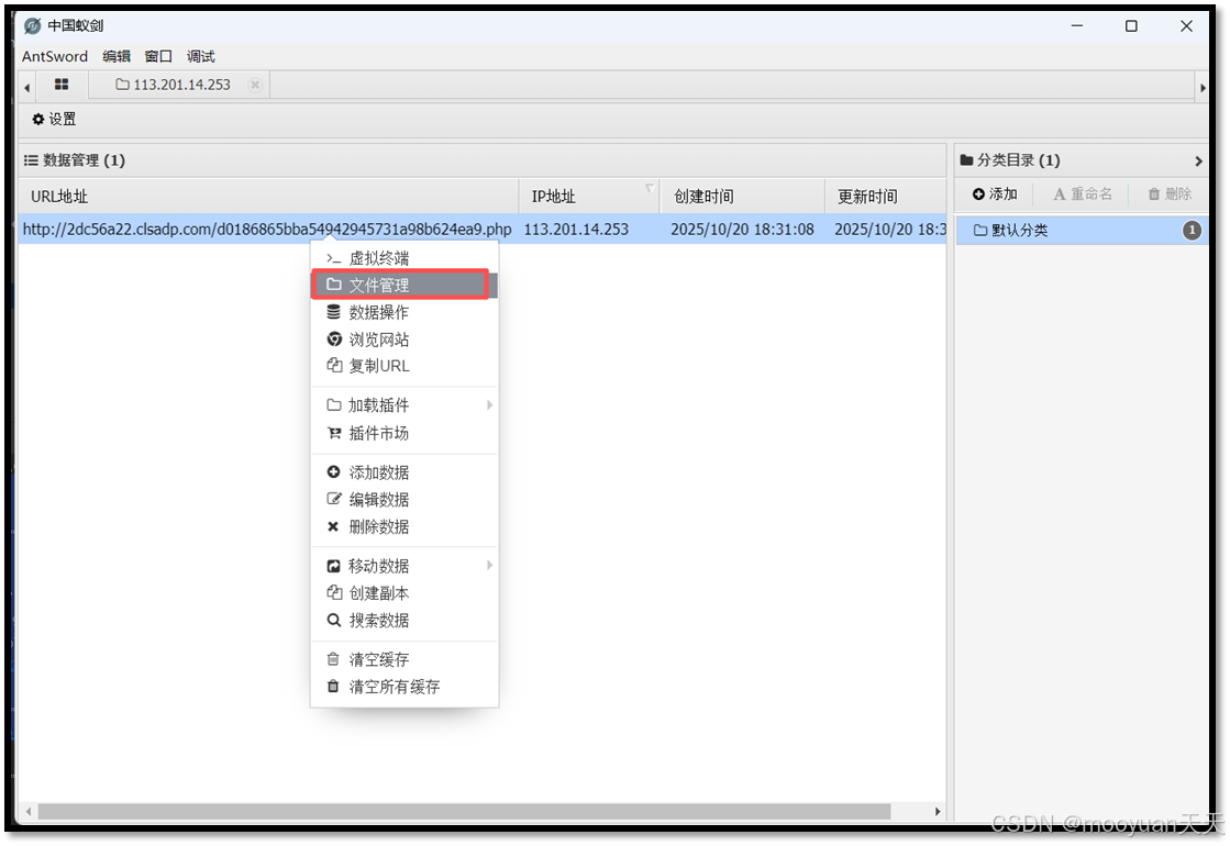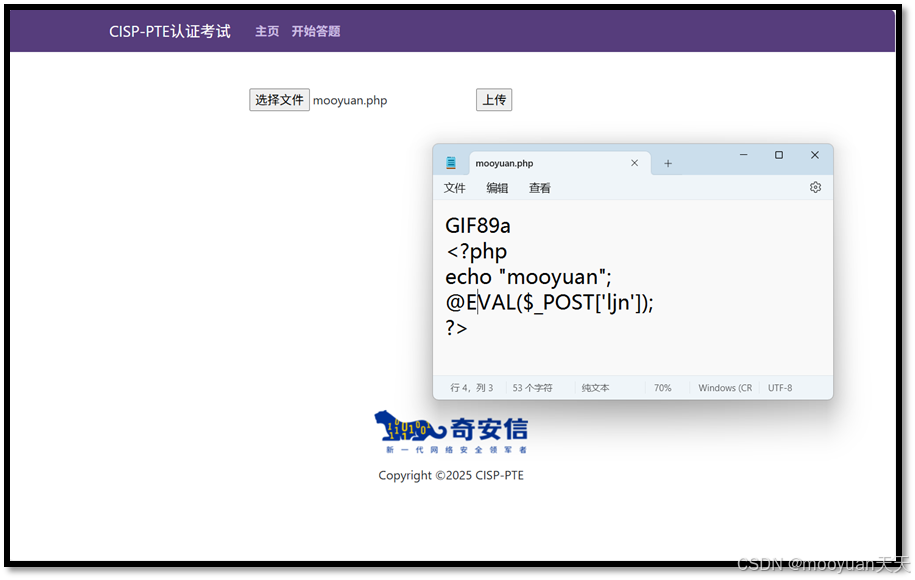 新建一个存放着一句话木马的php文件,脚本名为mooyuan.php。这段GIF89a文件头后嵌入PHP代码的文本,是一个伪装成GIF图片的WebShell后门。它利用图片文件头"GIF89a"绕过安全检查,当服务器被配置为将.gif文件解析为PHP时(如通过.htaccess设置),该文件就会被执行。其中的EVAL($_POST['ljn'])函数允许攻击者通过POST请求执行任意PHP代码,从而完全控制服务器,构成严重的安全威胁。