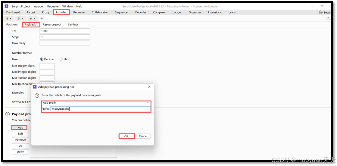 增加前缀为我们上传的文件名,我的环境中上传文件名为mooyuan.php,故而我们需要配置前缀为mooyuan.php,我们目前实现的就是1-1000中的数字,与前缀mooyuan.php的结合,如下所示。
