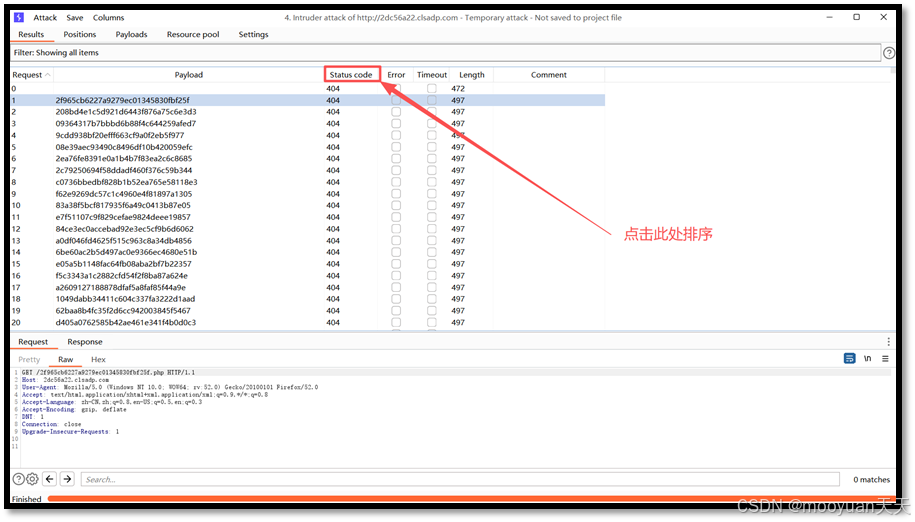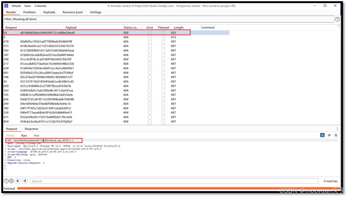 找到status为200的报文,说明上传的脚本名为/d0186865bba54942945731a98b624ea9.php,