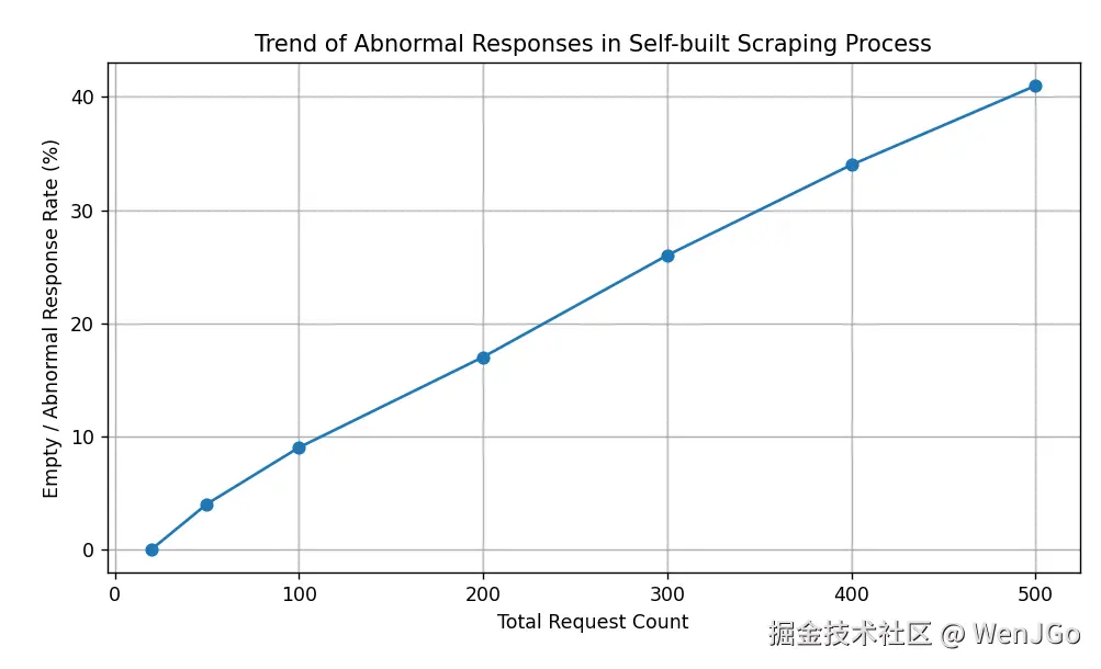 图:自建抓取流程中,随着请求数量增加,异常返回比例逐步上升。 即使在降低请求频率的情况下,该问题仍以间歇性方式出现,对长期大量任务的数据完整性产生影响。