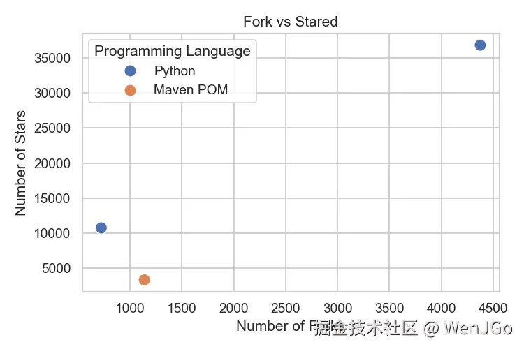 说明:该散点图展示了每个仓库文件的 Fork 数量与 Star 数量之间的关系,并用不同颜色区分编程语言,可直观了解仓库受欢迎程度与社区活跃度。