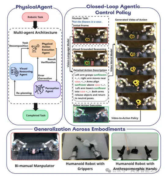 为解决这些问题,研究团队提出PhysicalAgent------一个融合迭代推理、扩散视频生成与闭环执行的机器人操控框架。其核心思路是:用基础模型(视觉语言模型、扩散视频模型)承担感知与推理的"重活",仅保留轻量级机器人适配层负责执行,最终实现跨形态、跨任务的通用操控,同时通过迭代修正提升执行鲁棒性。
