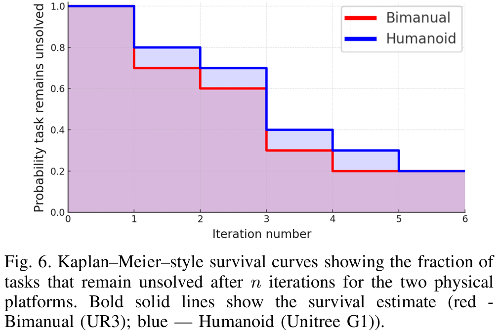 - 生存曲线:如figure 6所示,前3次迭代后未完成任务比例骤降,4次迭代后几乎所有可完成任务均成功------证明迭代修正能有效弥补首次执行的不足,是提升鲁棒性的核心。