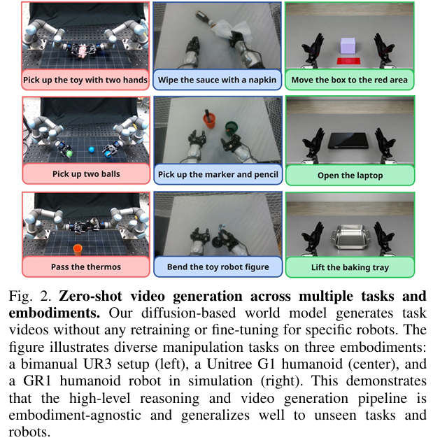 - 跨形态泛化的实现:如figure 2所示,同一感知-推理 pipeline 能为三种不同形态的机器人(双臂UR3、Unitree G1人形、仿真GR1)生成不同操控任务(如捡球、开笔记本、传递保温杯)的视频,无需针对特定机器人重训,直接证明了架构的跨形态适配能力。