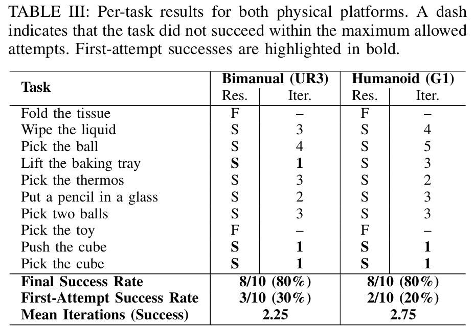 - 流程:生成计划与视频→执行→评估结果→可恢复则重规划,最多10次尝试;