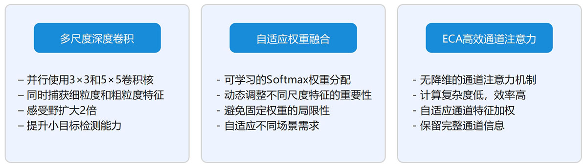 MSDA-ECA 算法在多方面展现出显著的技术优势。在计算效率方面,算法采用轻量级设计和深度可分离卷积策略,有效控制了参数量和计算复杂度,ECA 模块在参数量减少约 5 倍的情况下保持了性能几乎无损。在特征表达方面,通过多尺度自适应融合和可学习权重机制,算法能够在不同目标尺寸下自适应调整感受野,提升了检测精度和边界定位能力。在训练稳定性方面,DropPath 和 LayerScale 的引入有助于提升模型泛化能力和训练稳定性。此外,MSDA-ECA 在跨场景、跨尺度泛化以及与数据增强的协同方面均表现优异。实验结果表明,该算法使 mAP50-95 从 0.945 提升至 0.956,在参数效率、计算效率、检测精度、训练稳定性及泛化能力等多维度均明显优于传统方法。