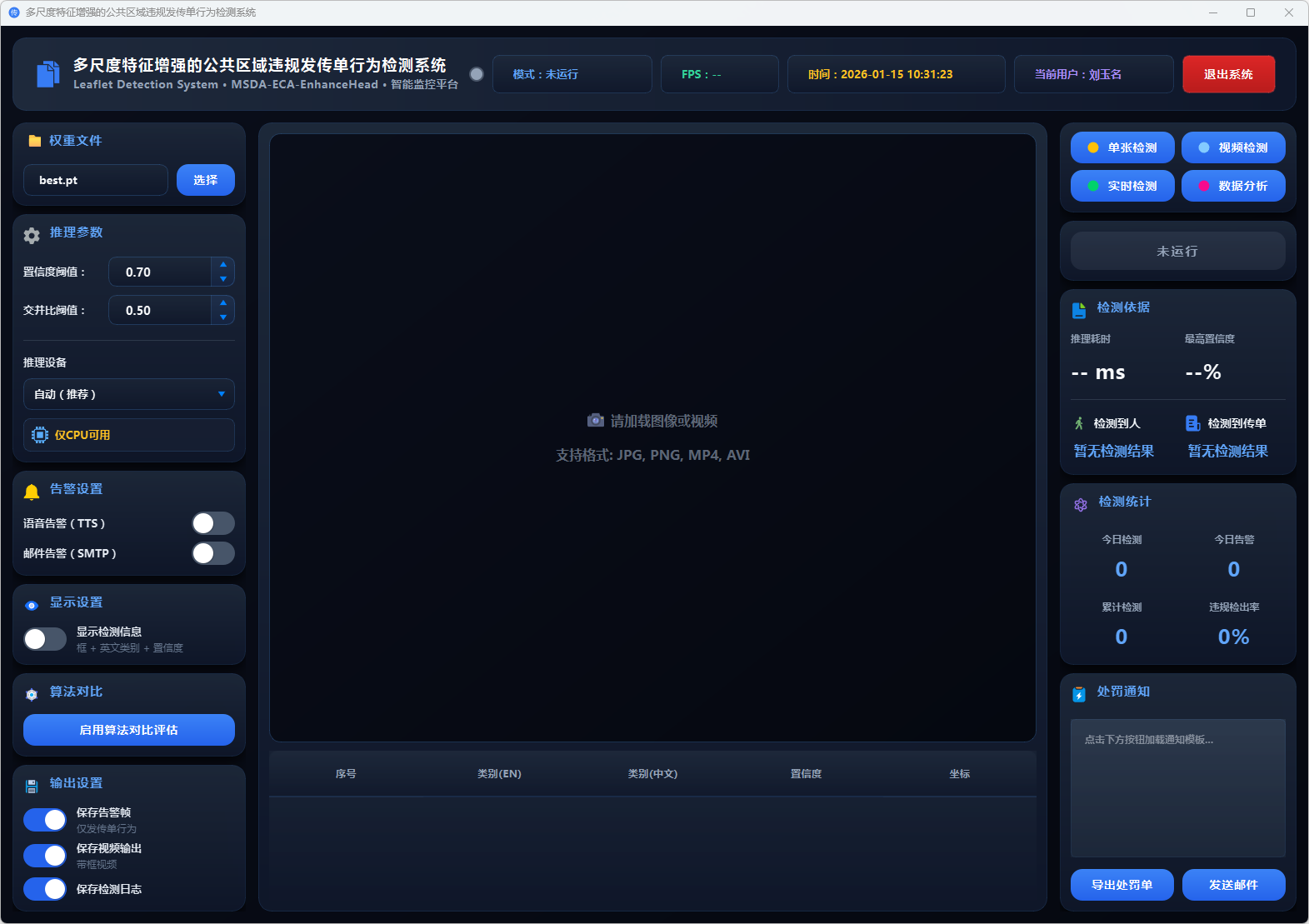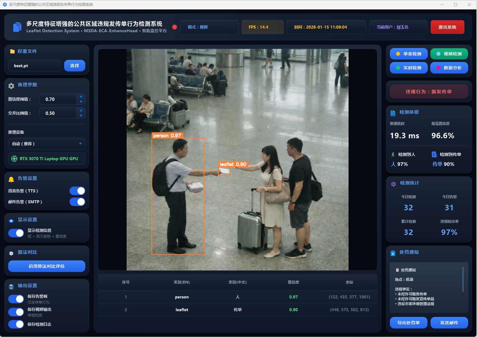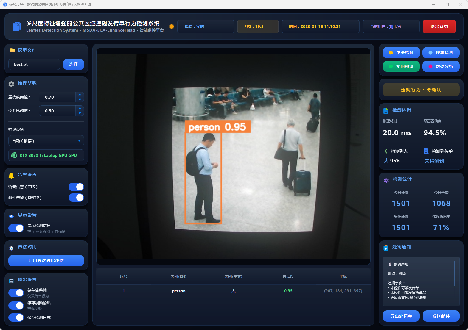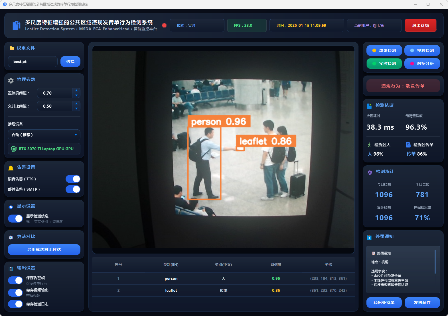 本系统基于 MSDA-ECA 增强的 YOLOv11 模型,实现了公共区域违规发传单行为的智能检测与管理。系统采用现代化的图形用户界面(GUI),提供图像检测、视频检测、实时摄像头检测三种检测模式,并集成了数据统计分析、违规记录管理、智能告警等功能,为城市管理部门提供高效、便捷的技术支撑。