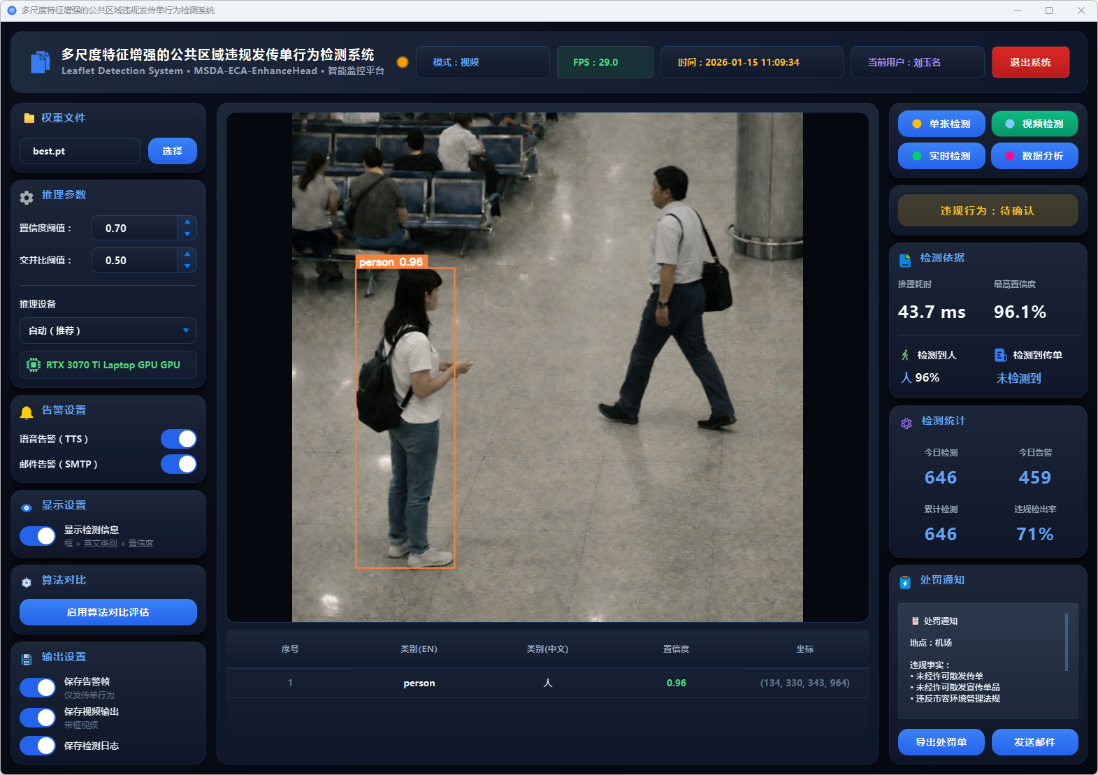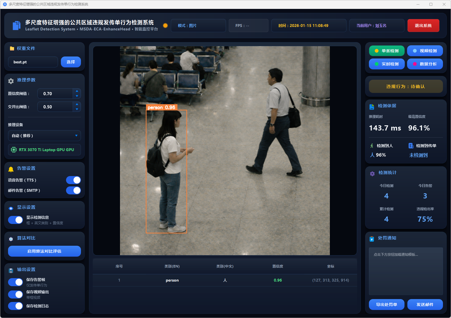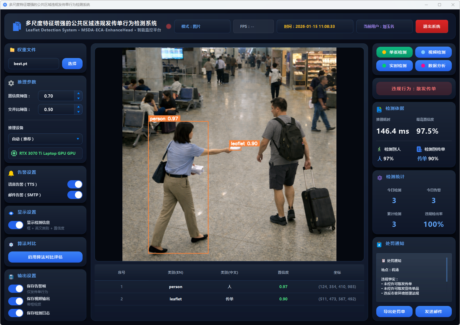 本系统基于 MSDA-ECA 增强的 YOLOv11 模型,实现了公共区域违规发传单行为的智能检测与管理。系统采用现代化的图形用户界面(GUI),提供图像检测、视频检测、实时摄像头检测三种检测模式,并集成了数据统计分析、违规记录管理、智能告警等功能,为城市管理部门提供高效、便捷的技术支撑。