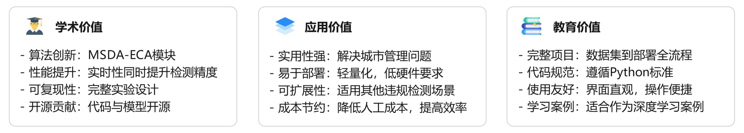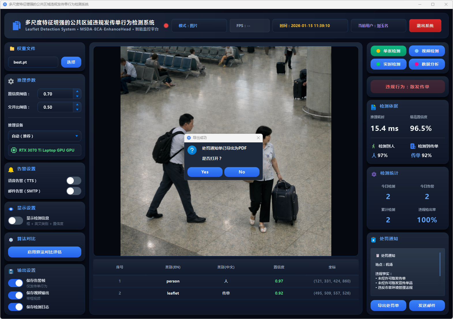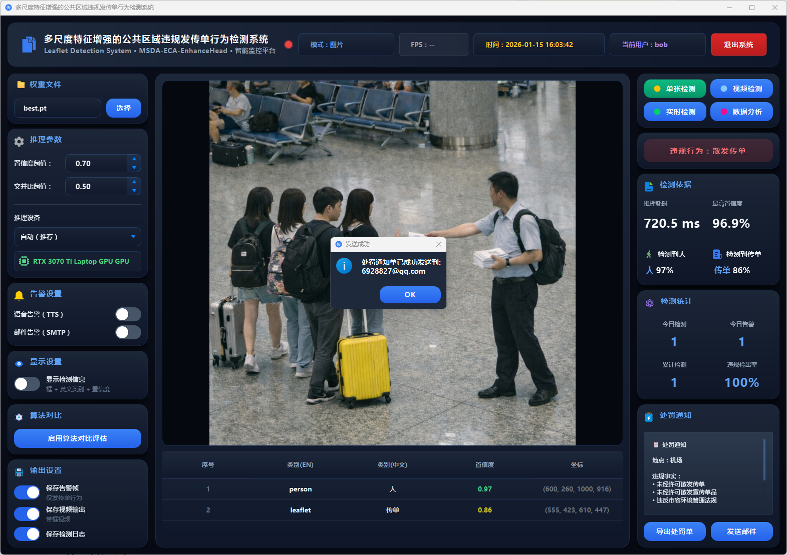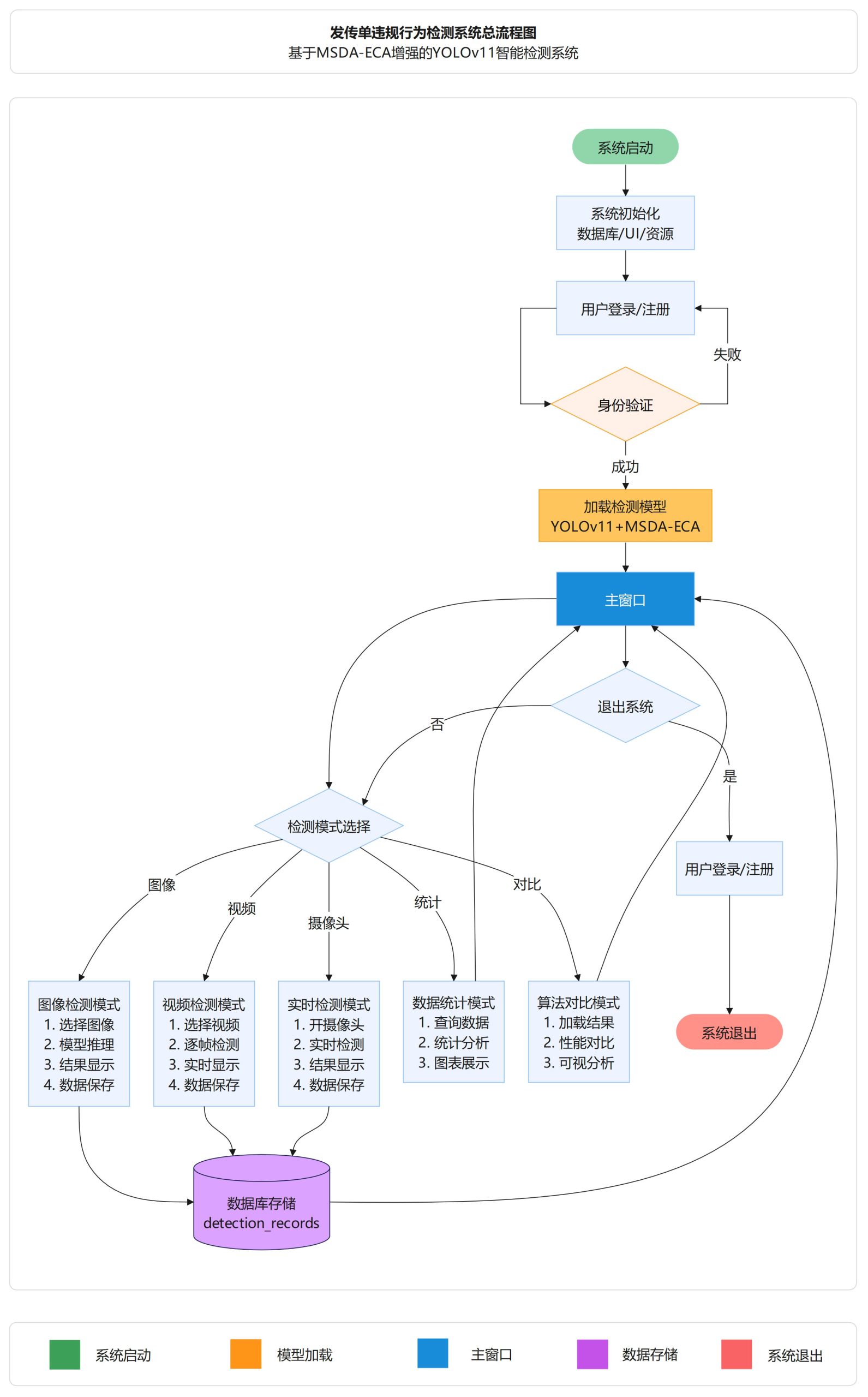 本系统基于 MSDA-ECA 增强的 YOLOv11 模型,实现了公共区域违规发传单行为的智能检测与管理。系统采用现代化的图形用户界面(GUI),提供图像检测、视频检测、实时摄像头检测三种检测模式,并集成了数据统计分析、违规记录管理、智能告警等功能,为城市管理部门提供高效、便捷的技术支撑。