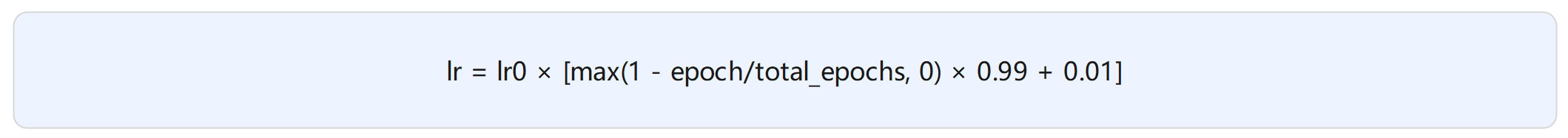 学习率调度策略采用线性衰减方式,前3个epoch进行warmup预热,学习率从0线性增长到初始学习率0.01,之后按线性方式从0.01逐步衰减到最终学习率0.0001。
