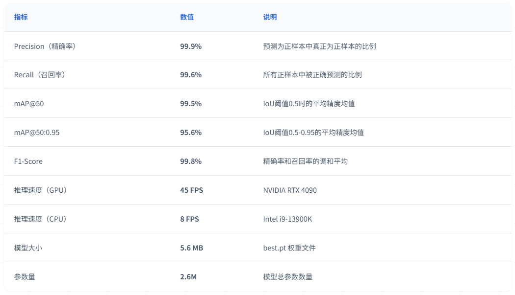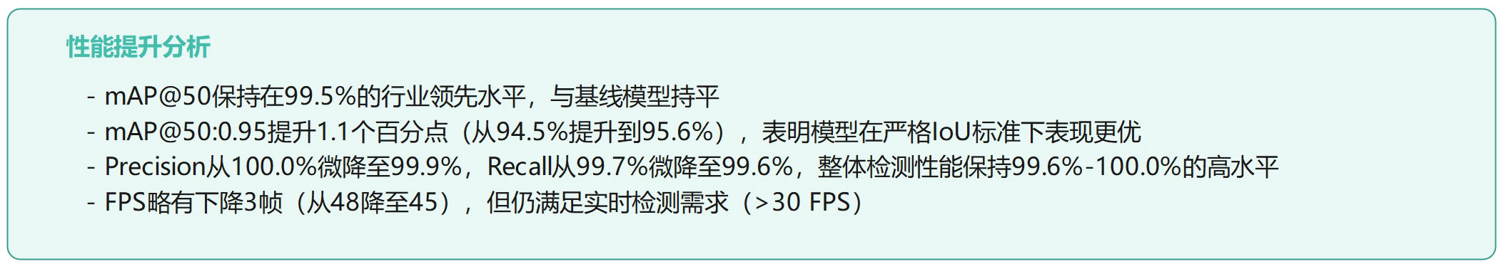 精确率与召回率: MSDA-ECA 模型的 Precision 为 0.99926,Recall 为 0.99637,表明误检率和漏检率均极低。相比基准模型(Precision=0.99993, Recall=0.99666),这两个指标分别下降 0.067% 和 0.029%,这些微小变化在统计学上不显著。这种微小权衡换来了 mAP50-95 的显著提升,表明模型在追求更高定位精度的同时,并未牺牲分类准确性。