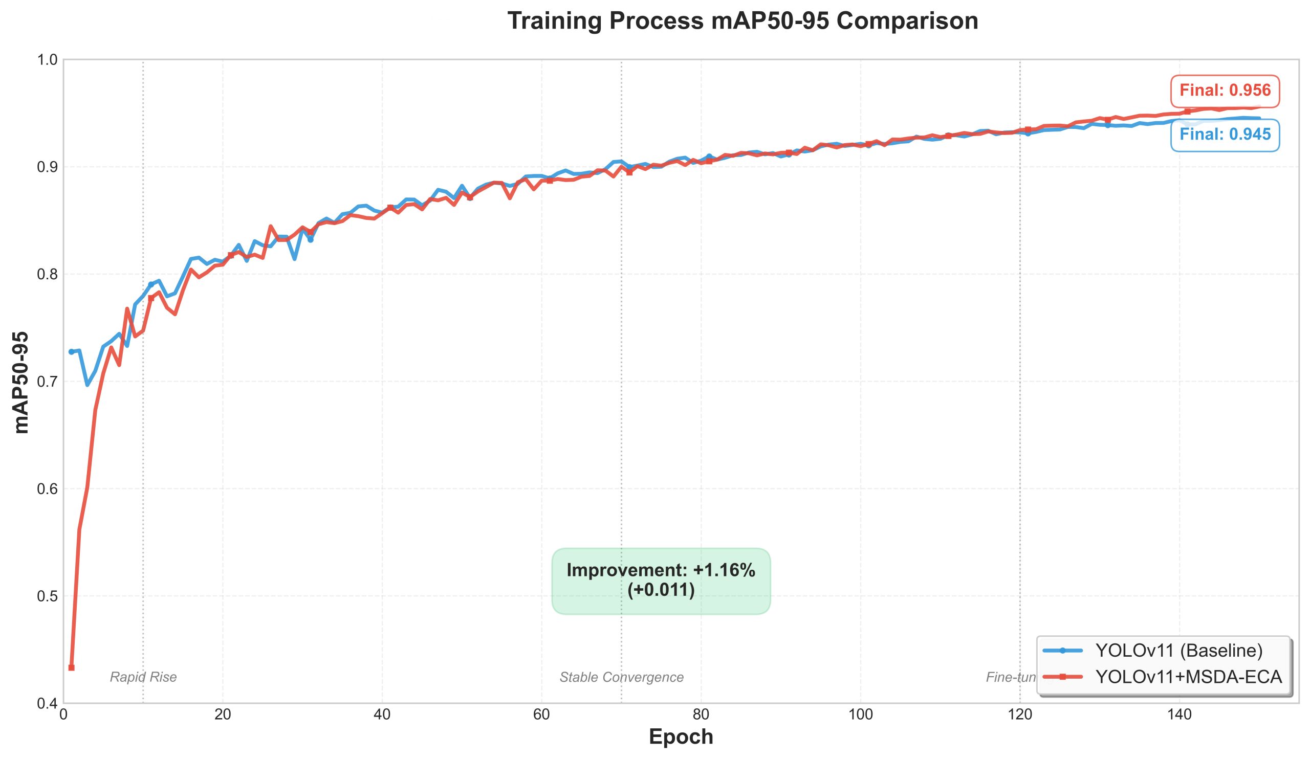 训练收敛分析。 图1 展示了两个模型在训练过程中的 mAP50-95 变化曲线。从曲线可以观察到,MSDA-ECA 模型在训练早期(epoch 10-30)就展现出明显优势,收敛速度更快。在训练初期的快速上升阶段,两个模型的性能都迅速提升,但 MSDA-ECA 模型的上升速度略快于基准模型。进入训练中期(epoch 30-100)的稳定收敛阶段后,两个模型的性能差距逐渐稳定在 1-2 个百分点,MSDA-ECA 模型始终保持领先。训练后期(epoch 100-150)进入精修阶段,MSDA-ECA 模型的性能持续提升且曲线平滑,没有出现明显的波动或过拟合现象,表明模型具有良好的训练稳定性和泛化能力。